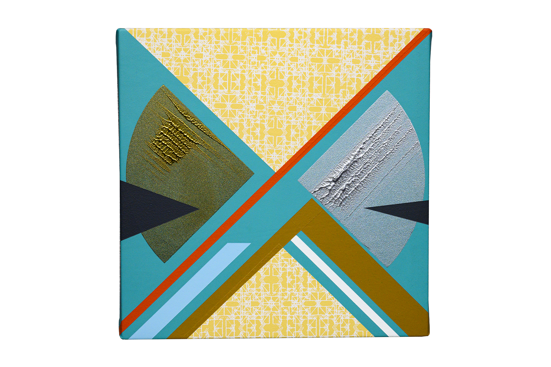 A small painting of geometric, hard-edge patterns layered between blocks of acrylic paint and serigraph prints originally created. This process leaves the surface with glossy accents over a matte finish.