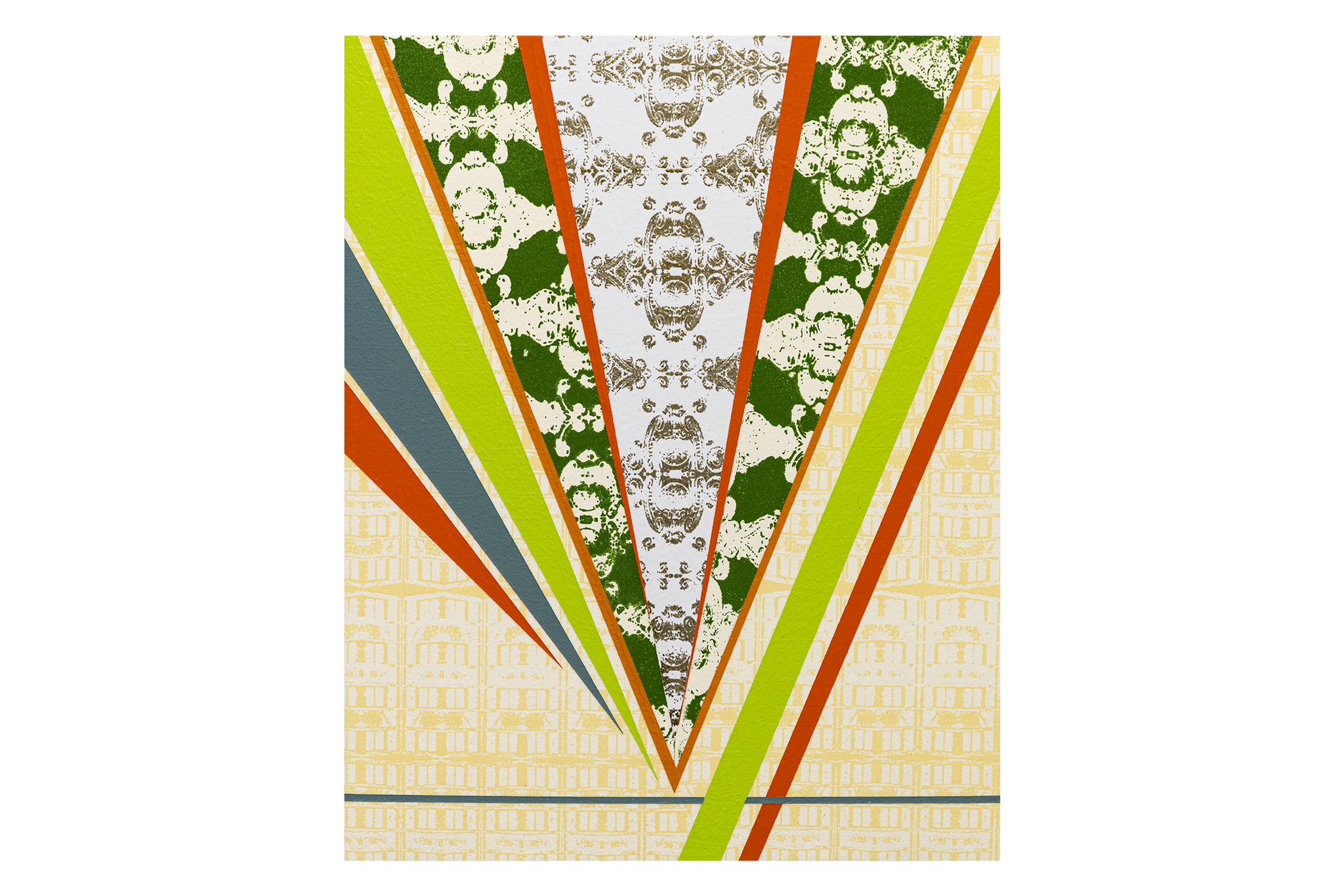Adreon's mastery of color and design are exhibited with layers of baroque screen prints over hard edge color blocks. All work is originally created by Henry, including burning his own screen designs.