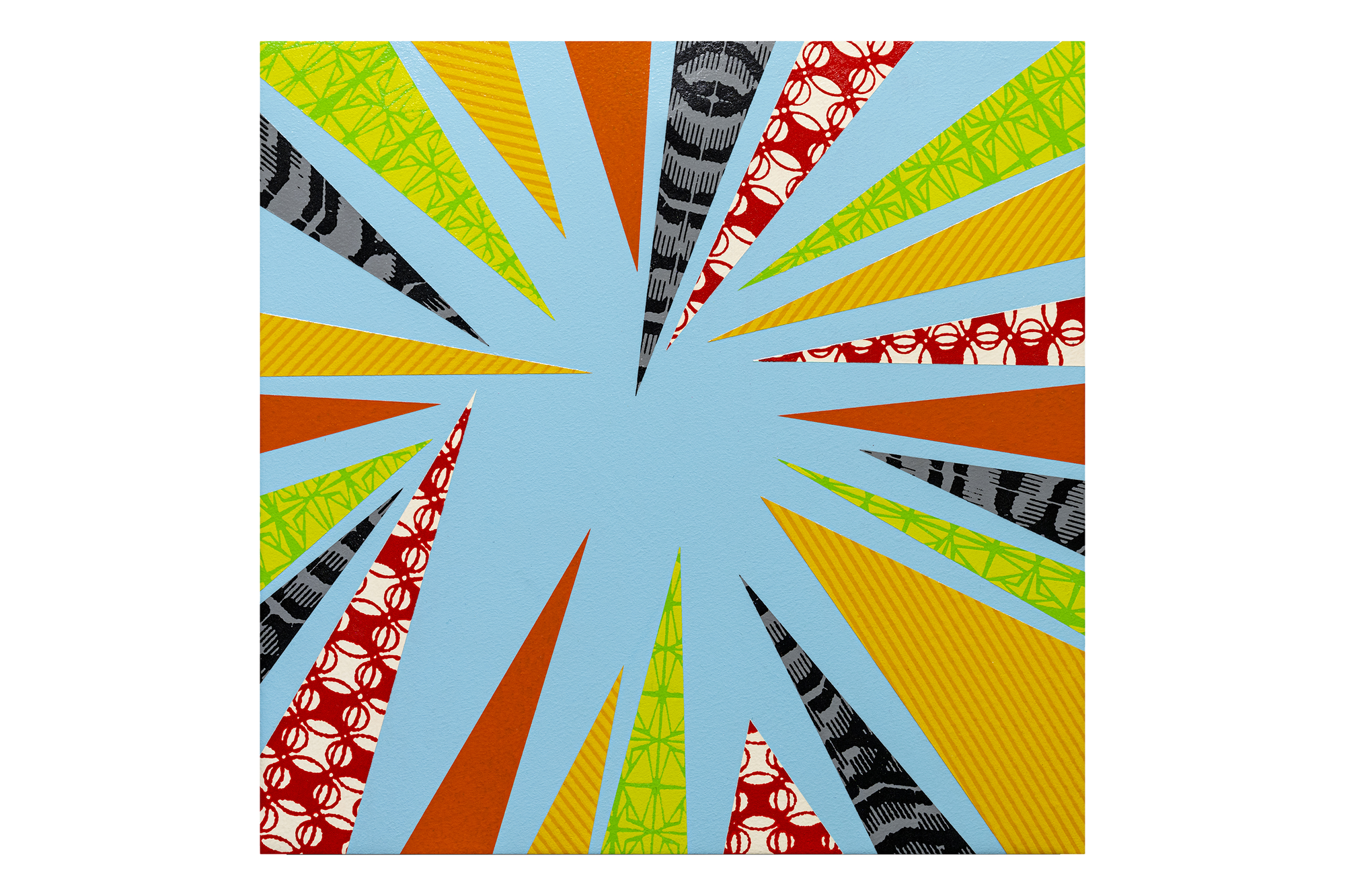 Adreon Henry has been producing silkscreen on vinyl for over 25 years. Over the years he has produced a wide range of styles from pop to texture to abstract art with vinyl. This piece is a colorful hard edge design with original silkscreen patterns placed over bright color blocks.