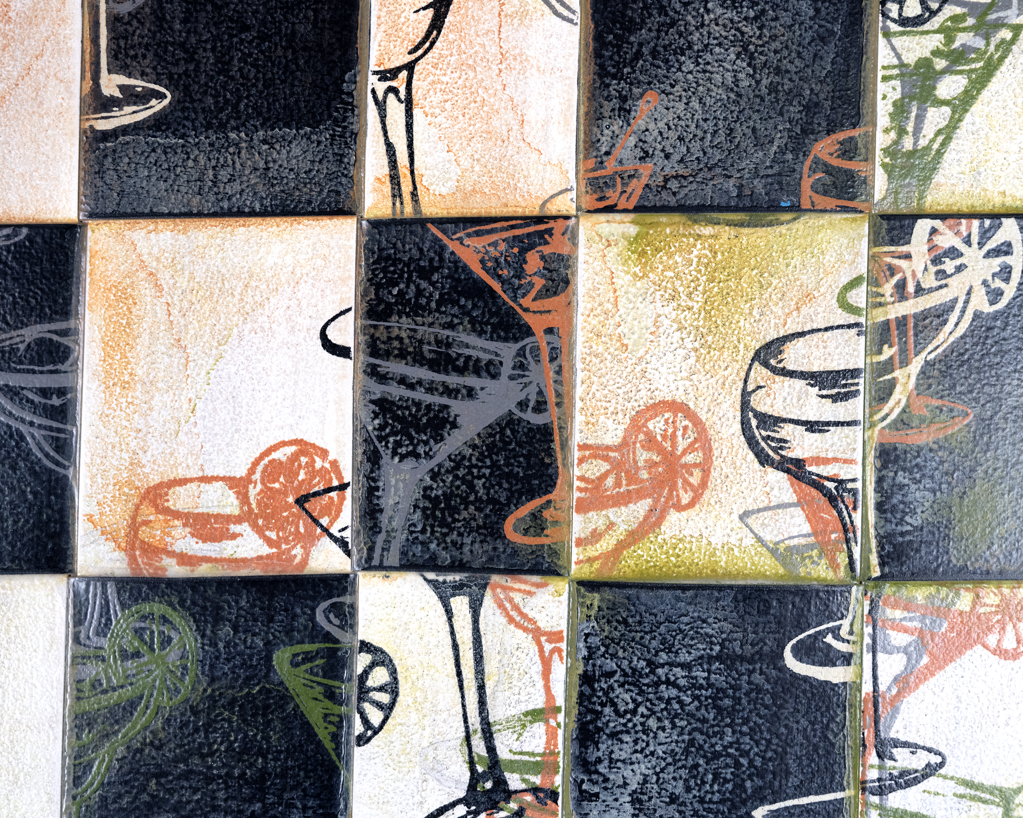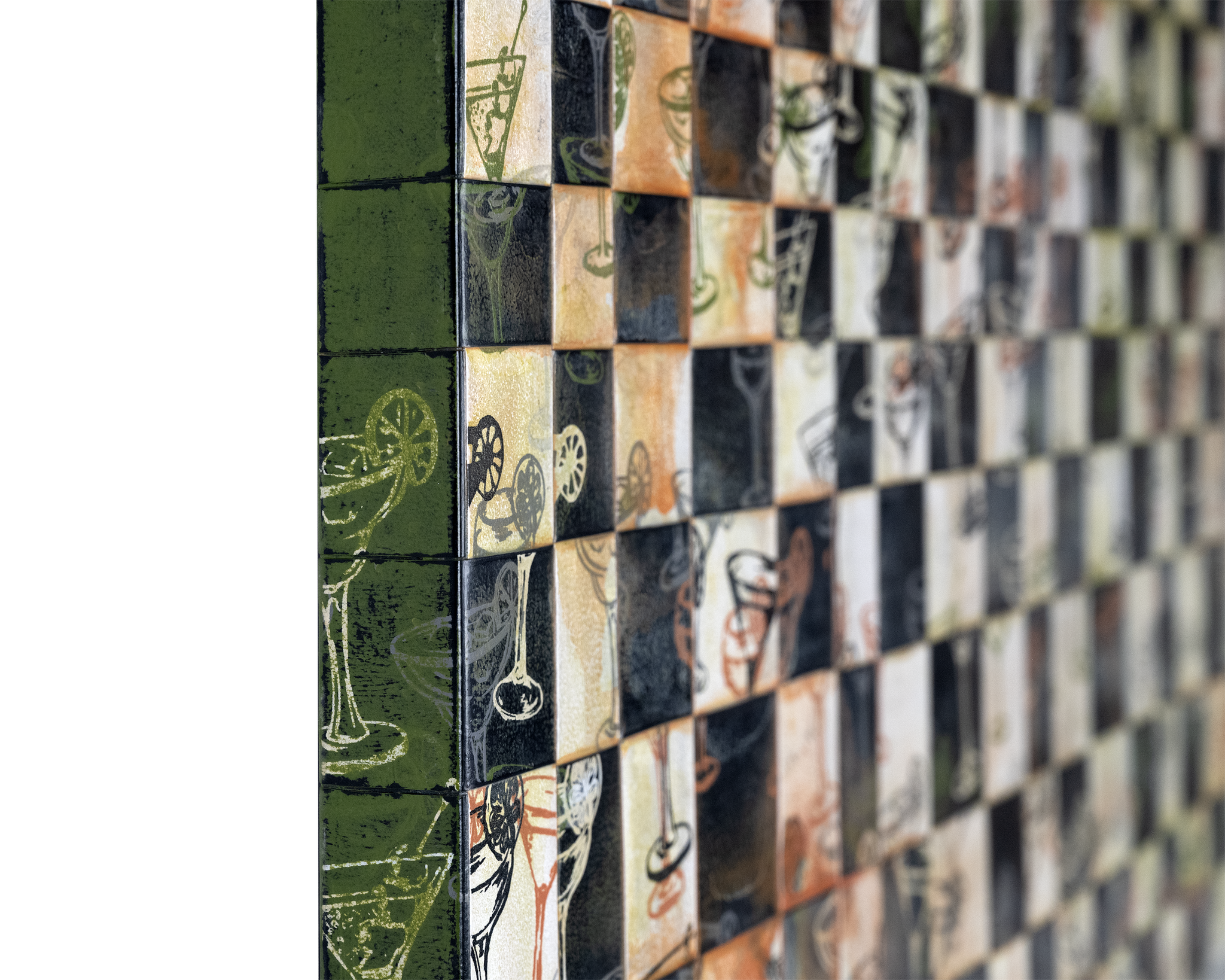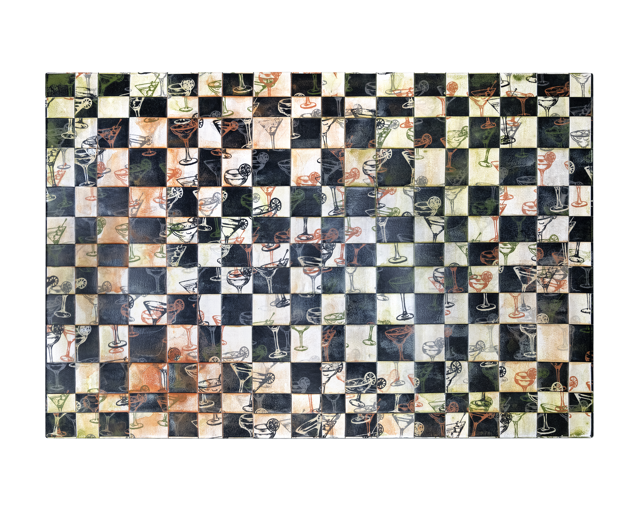 Friday at 5 is a woven vinyl painting by Austin-based artist Adreon Henry, featuring a striking black-and-white surface layered with serigraph cocktail imagery in vivid oranges and greens. Industrial-grade vinyl is woven into a tactile grid, creating a bold foundation where texture and image collide.