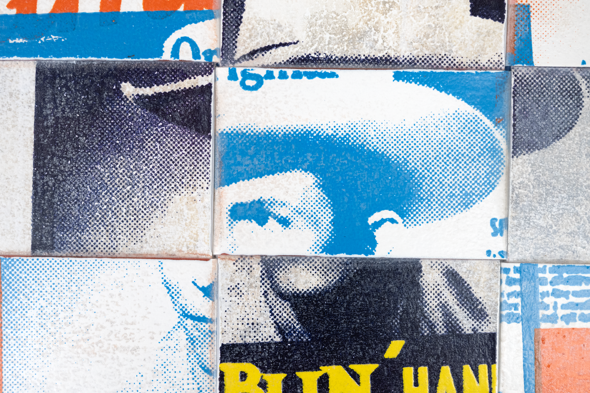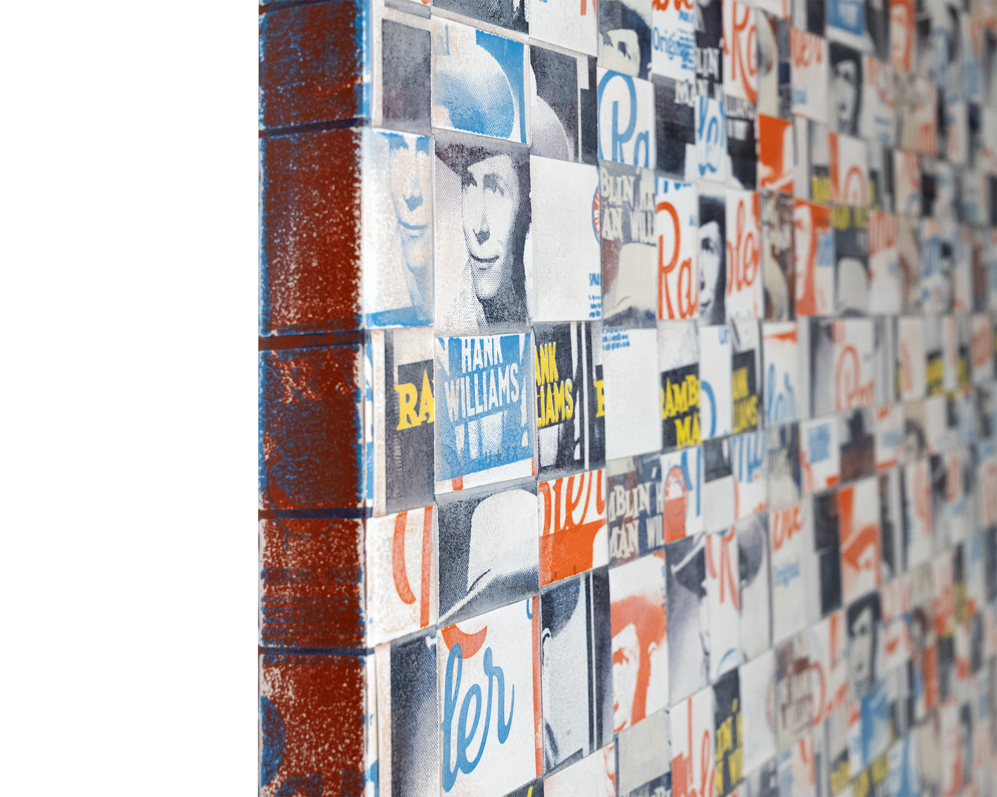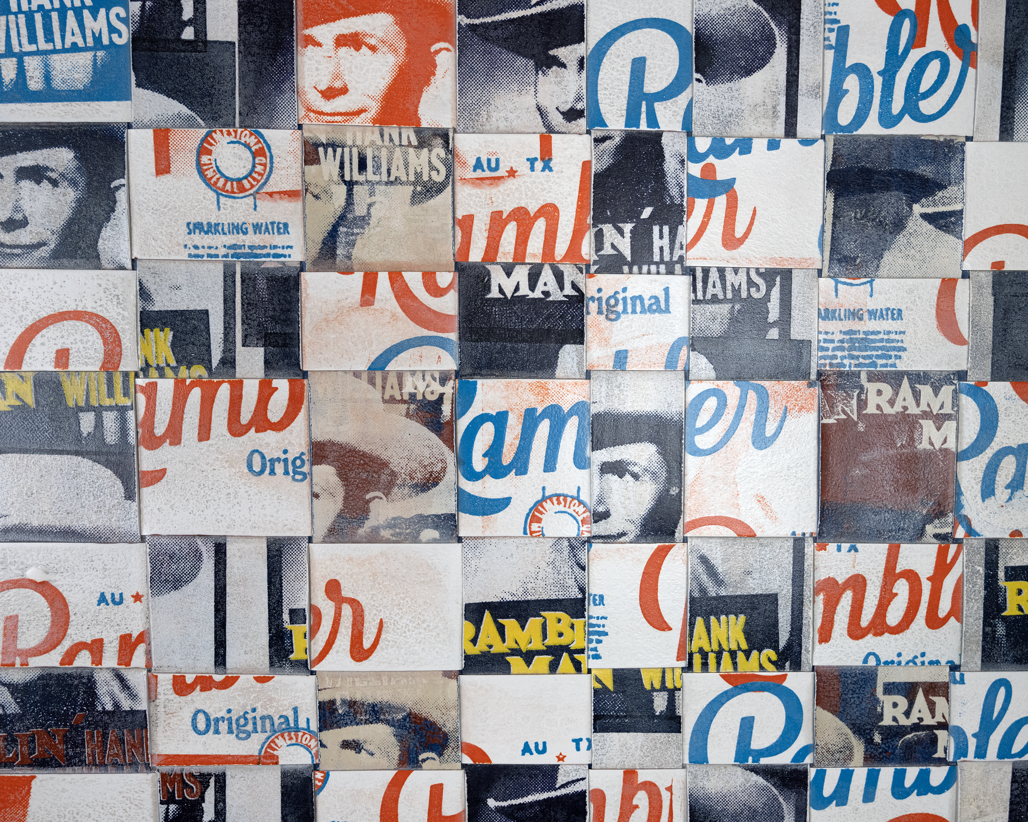 Long Way is a woven serigraph painting by Austin-based artist Adreon Henry, created from industrial-grade vinyl strips screen printed with imagery pulled from everyday American iconography—most notably the Rambler water label and Hank Williams. Intertwined and woven together in layered tones of blue, white, and orange, the work balances bold graphic clarity with tactile depth, turning familiar symbols into something fragmented, rhythmic, and newly charged.