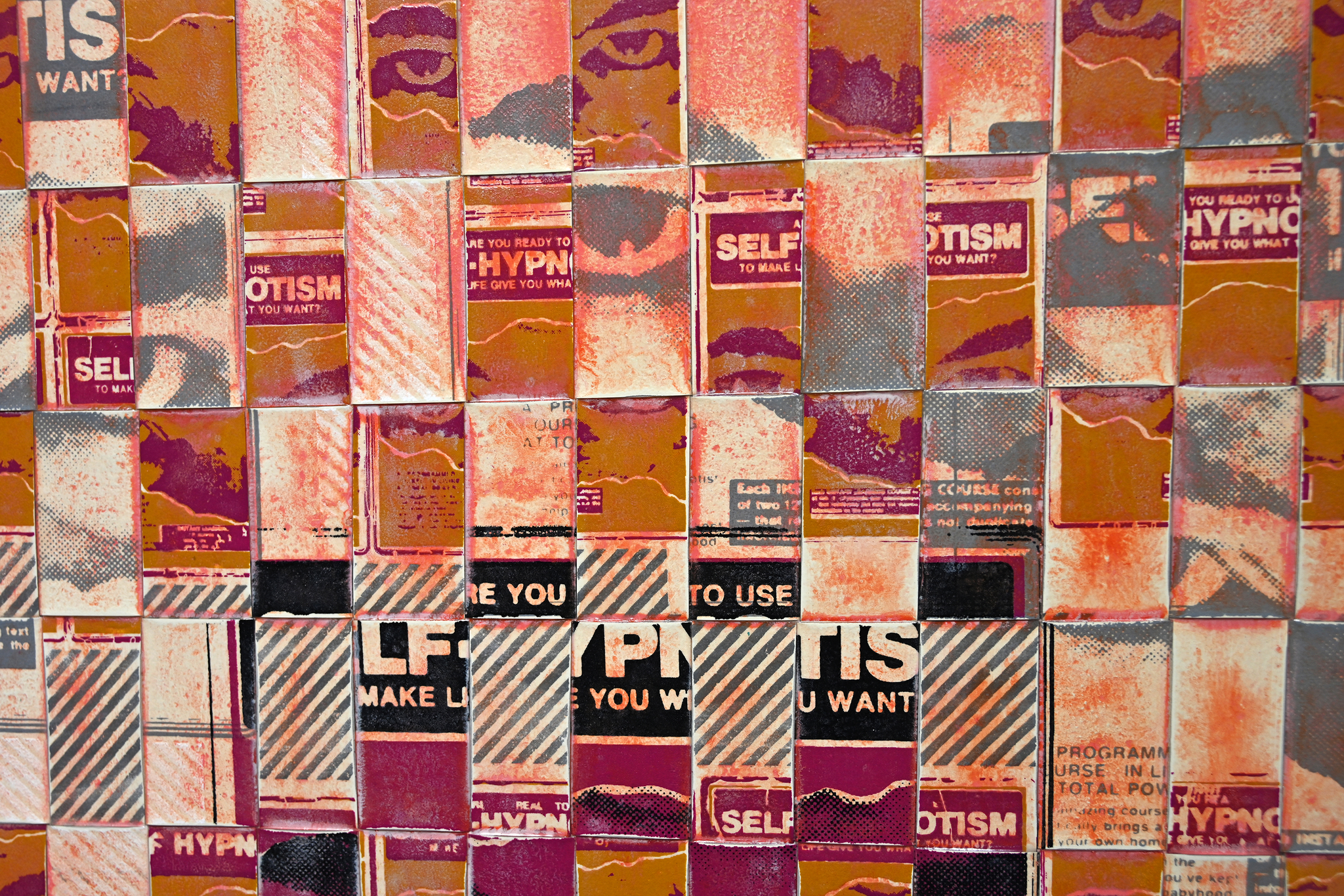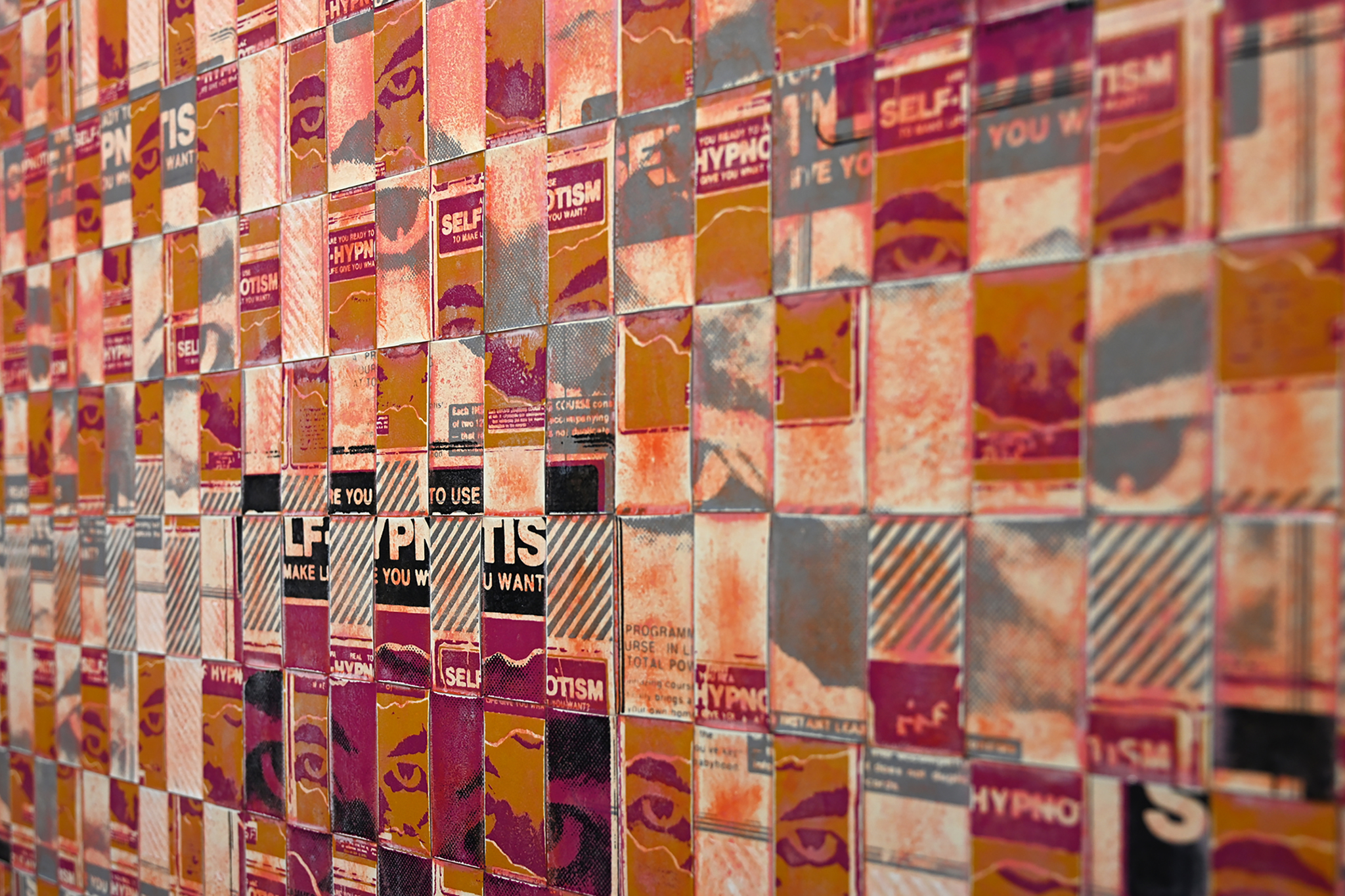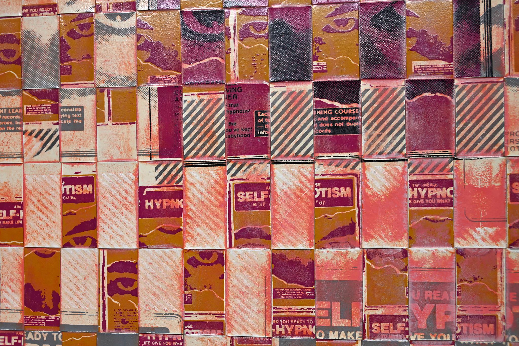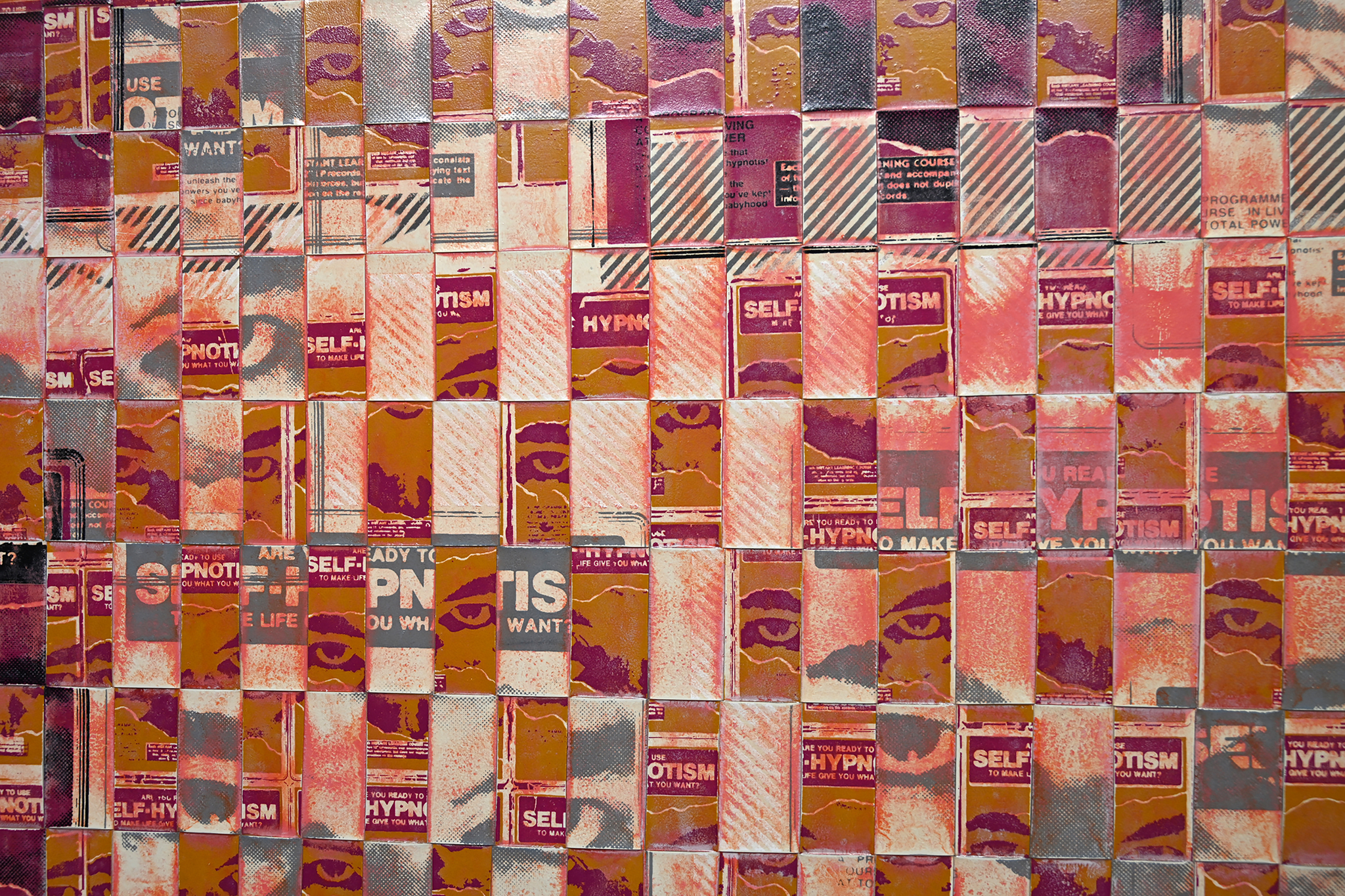 The artwork is hand screen printed onto two sheets of clear, industrial-grade vinyl, then cut and woven over a custom-built wooden frame. After weaving, the surface is layered with multiple coats of acrylic paint, allowed to dry, and then carefully sanded back to reveal the silkscreen imagery beneath. The final piece is sealed with a water-based polyurethane for protection and finish.